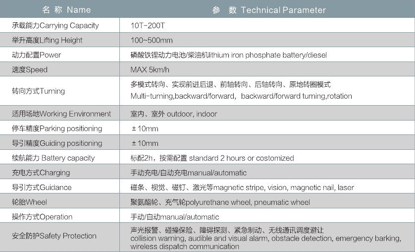 装载能力10T-200T,根据用户需求,引导车的动力和执行机构形式、车辆长度、宽度、提升高度、驱动能力、连续形式里程等均可按需设计。标准重量的工业移动机器人类型如下: